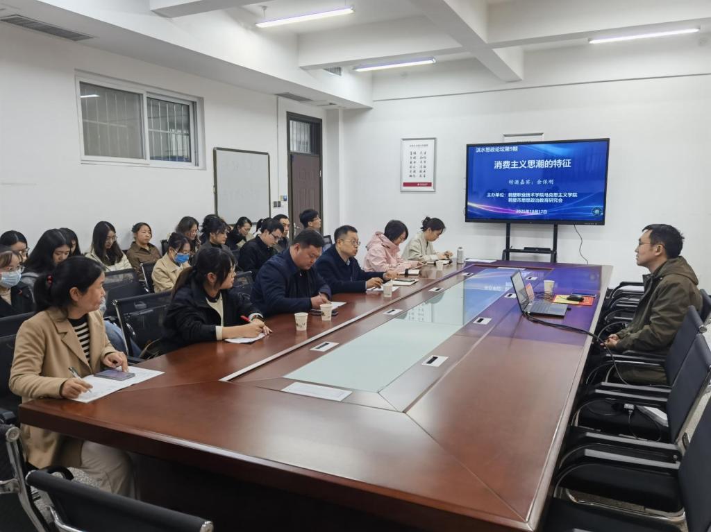 10月17日下午,第9期淇水思政论坛在马克思主义学院会议室举行。本期论坛由马克思主义学院和鹤壁市思想政治教育研究会主办,特邀河南师范大学马克思主义学院副院长余保刚教授做题为“消费主义思潮的特征”的报告。论坛由学院党总支书记、院长王勇强主持,马克思主义学院全体教师及鹤壁汽车工程职业学院、鹤壁能源化工职业学院的马克思主义学院部分思政课教师参加。