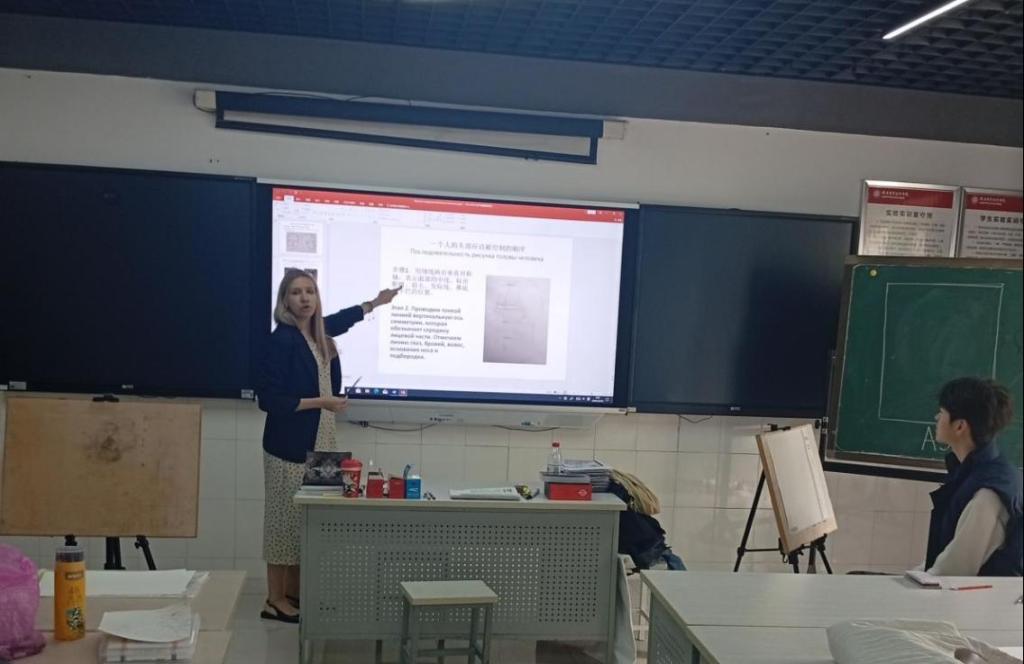 大师课聚焦中俄肖像艺术对比和俄罗斯传统头巾的文化符号与审美价值,结合经典作品引导学生理解文化与艺术的融合,同时以学生为模特指导中国女性肖像素描创作,深耕构图设计与细节刻画技法。在研讨环节,外教还解读了俄罗斯肖像画派的成就与特质,并与师生共同探讨中俄艺术的异同。