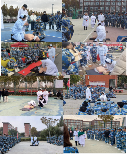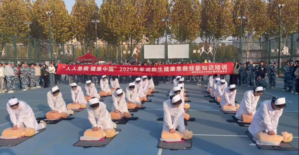 2025年11月12日下午,鹤壁职业技术学院玉兰园田径场内,旌旗飘扬,气氛热烈。由鹤壁职业技术学院护理学院党总支牵头开展的“‘人人急救·健康中国’2025年军训新生健康急救技能知识培训”正式拉开帷幕。护理学院党总支充分发挥专业优势,组织28名党员教师、百余名优秀学生及志愿者组成培训团队,为全校近5000名军训新生带来实战化急救技能培训。”