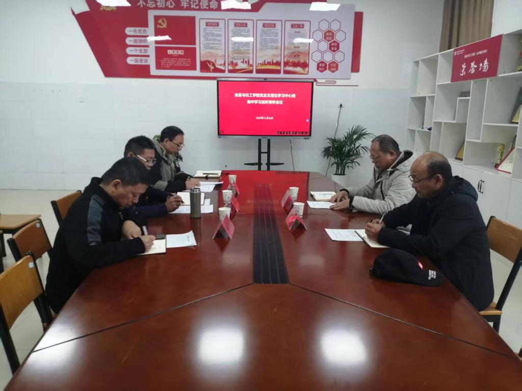 11月26日,食品与化工学院党总支理论学习中心组专题学习会议在诚信6号楼A203室举行。后勤保障监管处党总支书记张玉柱、随行人员高勇到会巡听旁听,学院党总支理论学习中心组成员参会,会议由党总支副书记王跃强主持。