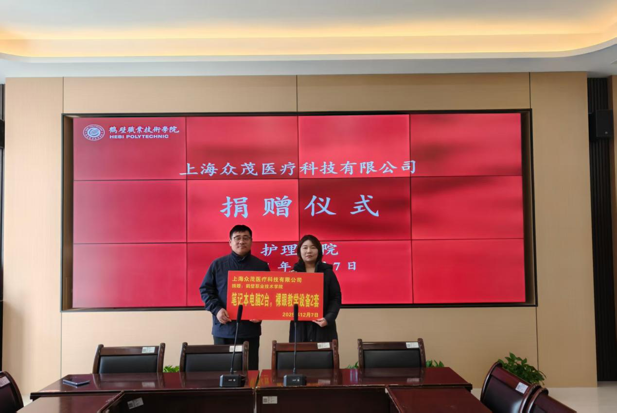 为进一步支持学校教育教学改革与信息化建设,赛后上海众茂医疗科技有限公司向鹤壁职业技术学院捐赠笔记本电脑2台、裸眼教学设备2套,用于提升护理实训教学的智能化与互动性。这一举措彰显了企业对职业教育发展的支持,也深化了校企合作的内涵。