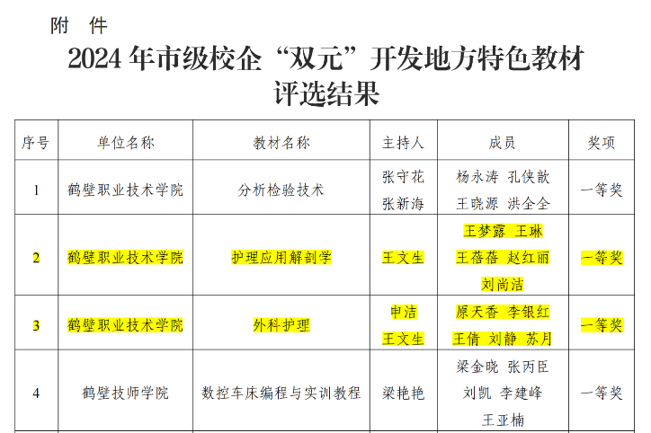 为响应国家职业教育改革号召,深入推进产教融合、校企合作,护理学院现已成功开发8本“双元”合作教材,荣获鹤壁市社会科学成果一等奖1项、鹤壁市“双元”地方特色教材一等奖2项、二等奖2项,为培养高素质技术技能型护理人才提供了有力支撑。
