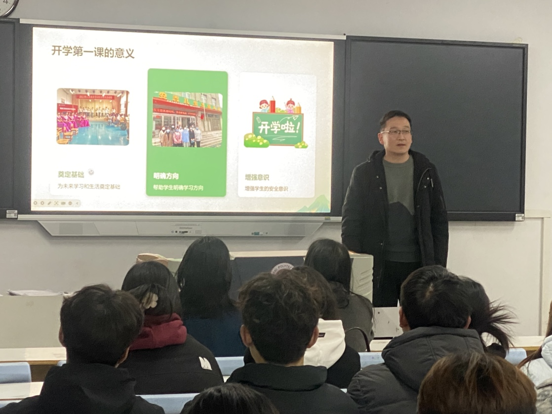 当晚,学院以“开学第一课”主题班会为起点,组织全院所有班级开展返校收心与安全教育活动。班会上,领导班子全体成员亲临教室,分组给同学们上“开学第一课”,通过“三聚焦”强化育人实效:聚焦学业规划,结合专业特色分析新学期课程重点,引导学生制定学习计划;聚焦安全警示,以高校火灾事故为例,重点解读宿舍用电规范、禁烟要求及应急逃生知识;聚焦心理健康,针对学生可能遇到的学习压力、人际关系困扰以及心理疾病等问题,积极引导学生掌握调节方法,鼓励以积极心态面对学习生活。裴小鹏在班会中强调:“安全是成长成才的前提,每位同学都应成为平安校园的践行者和监督者。”