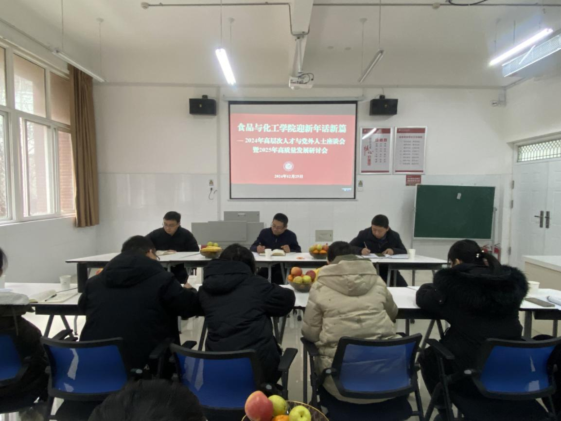 12月25日下午,食品与化工学院党总支在诚信6号楼A107会议室成功举办了“迎新年话新篇——2024年高层次人才与党外人士座谈会暨2025年高质量发展研讨会”。本次会议汇聚了学院领导、教学名师、骨干教师、博士、高级职称教师、鹤壁市高层次人才(E类)、民主党派教师及党外人士等各方代表,共同为食品与化工学院发展出谋划策,旨在为2025年学院高质量发展奠定坚实基础。会议由党总支副书记王跃强主持。