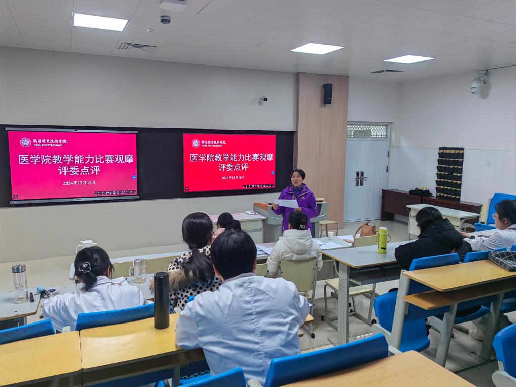 12月18日,医学院在D315智慧教室开展教师教学能力比赛选拔赛,比赛邀请护理学院孙秀青、高雅琪、秦顺朵等3名教师为评委,我院全体教师参加,比赛由副院长宋晓光主持。