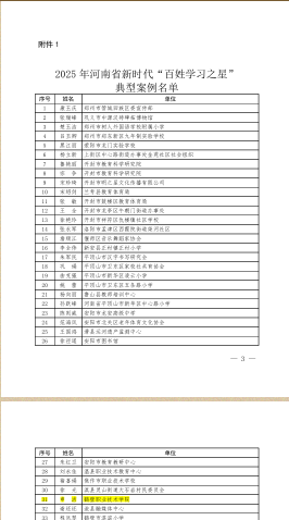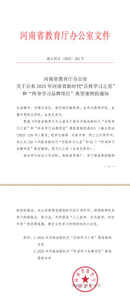 2025年10月,河南省教育厅办公室公布2025年河南省新时代“百姓学习之星”和“终身学习品牌项目”典型案例的通知,120个河南省新时代“百姓学习之星”和87个“终身学习品牌项目”典型案例予以公布。我校医学院“中医药文化科普项目”入选2025年河南省“终身学习品牌项目”、申洁老师入选2025年“百姓学习之星”推介。