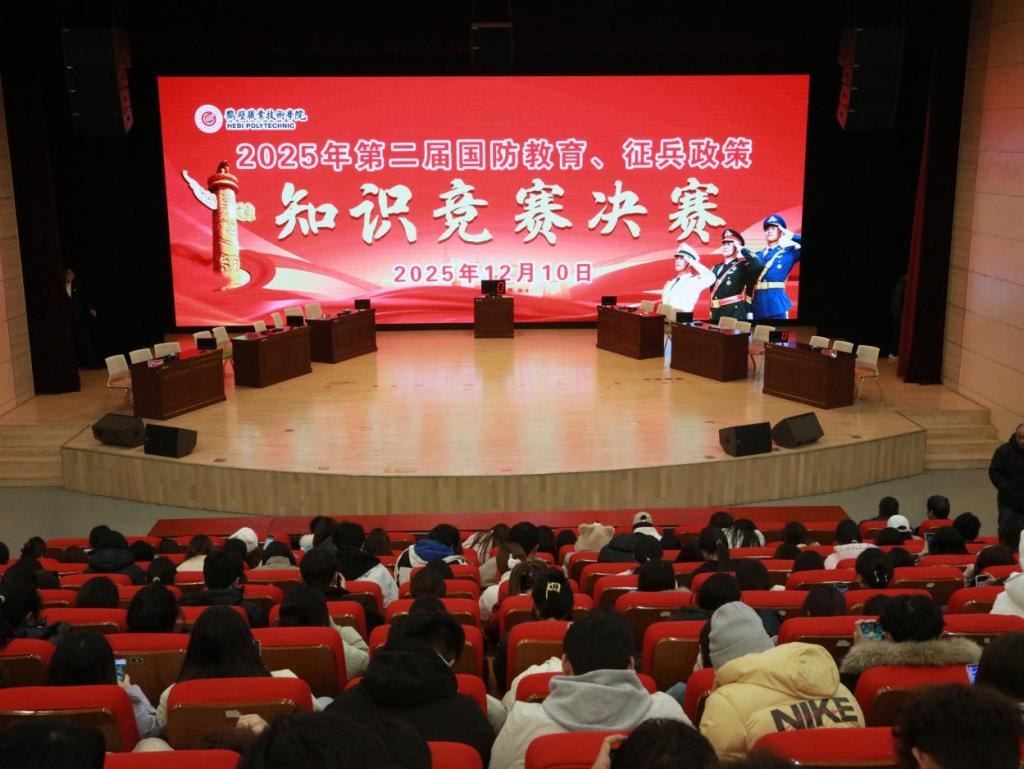 12月10日,2025年第二届国防教育、征兵政策知识竞赛总决赛在学校海棠园校区诚信礼堂成功举行。鹤山区人武部部长李中全,学校学生工作部、武装部、护理学院等部门领导出席总决赛并为获奖代表队颁奖。学校师生代表400余人现场观看总决赛。
