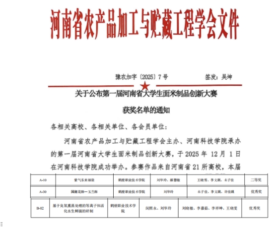 近日,河南省农产品加工与贮藏工程学会公布第一届河南省大学生米面制品创新大赛获奖名单,食品与化工学院教师参赛作品分别斩获二等奖1项、优秀奖2项。