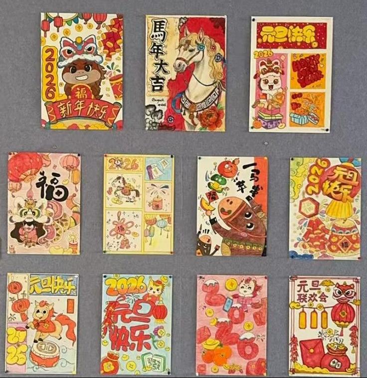 近日,教育与艺术学院“喜迎新年·创意绽放”学生美术作品展正式开展。本次展览以“新年”为核心主题,聚焦节日氛围营造与中外文化融合,作品涵盖绘画、设计等多元形式——既有融入“福”字、年画等传统元素的创作,也有充满现代感的创意表达,尽显巧思。