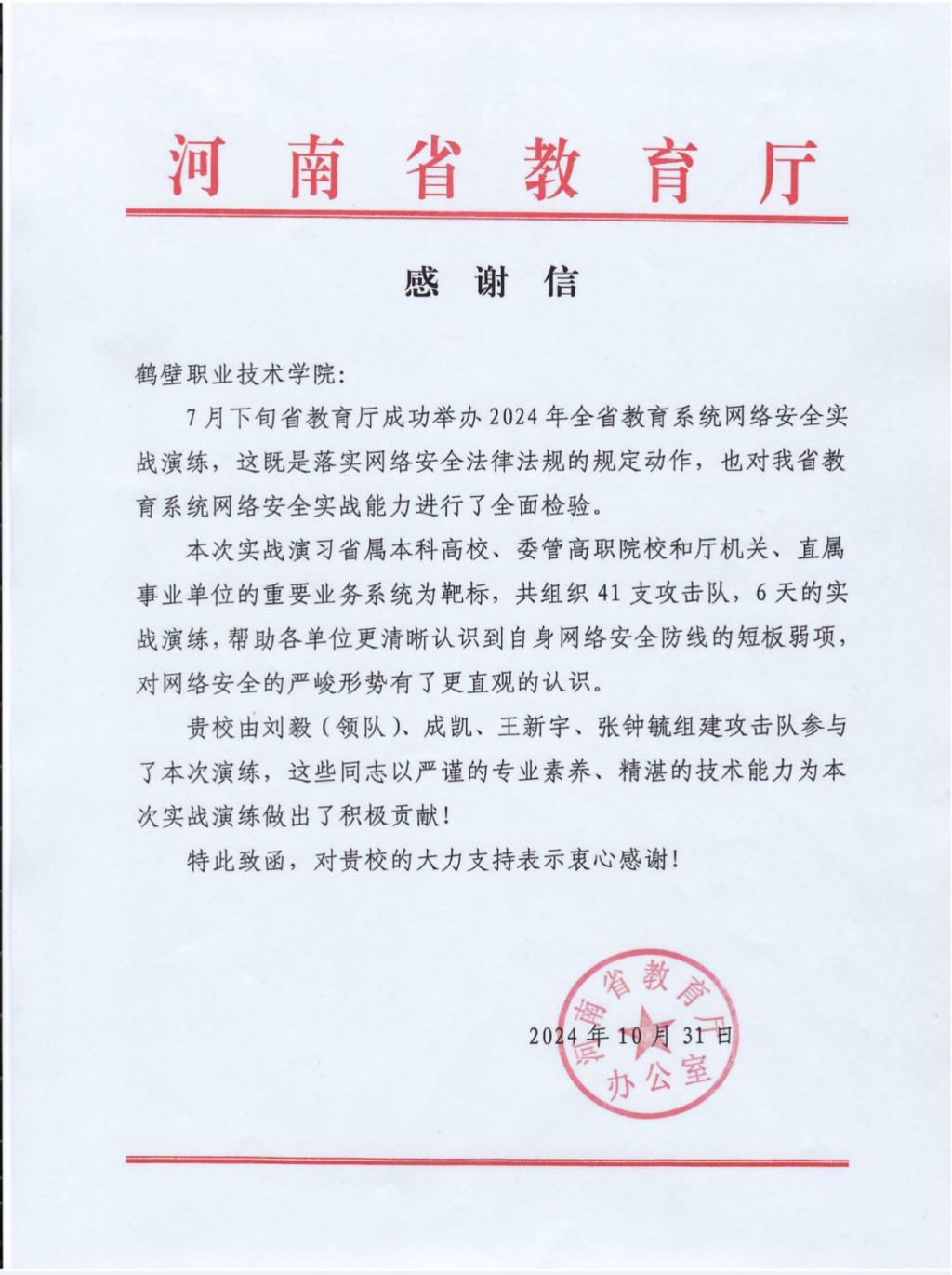 近日,学校收到了来自河南省教育厅的感谢信,对在2024年全省教育系统网络安全实战演练中,学校大数据学院成凯、王新宇、张钟毓等三位同学组建的网络安全攻防战队以严谨的专业素养、精湛的技术能力为实战演练做出的积极贡献予以感谢。