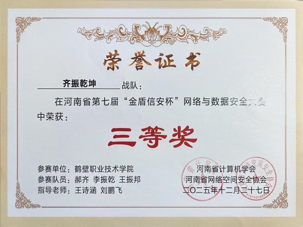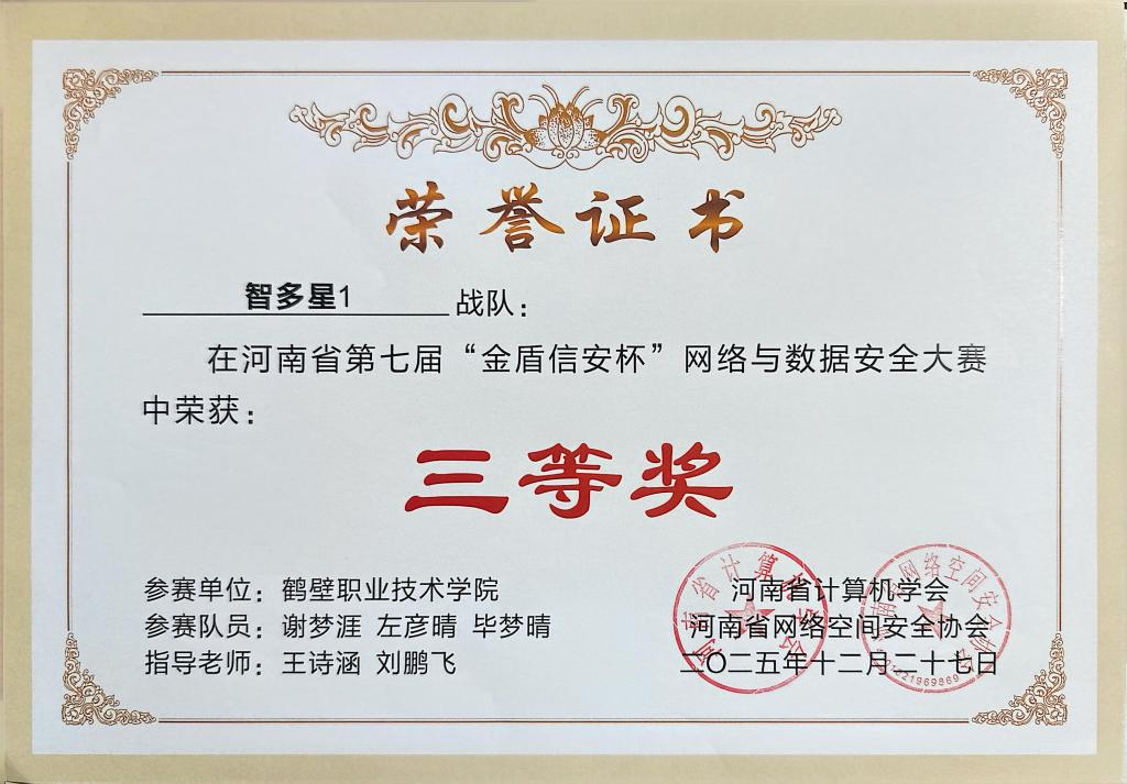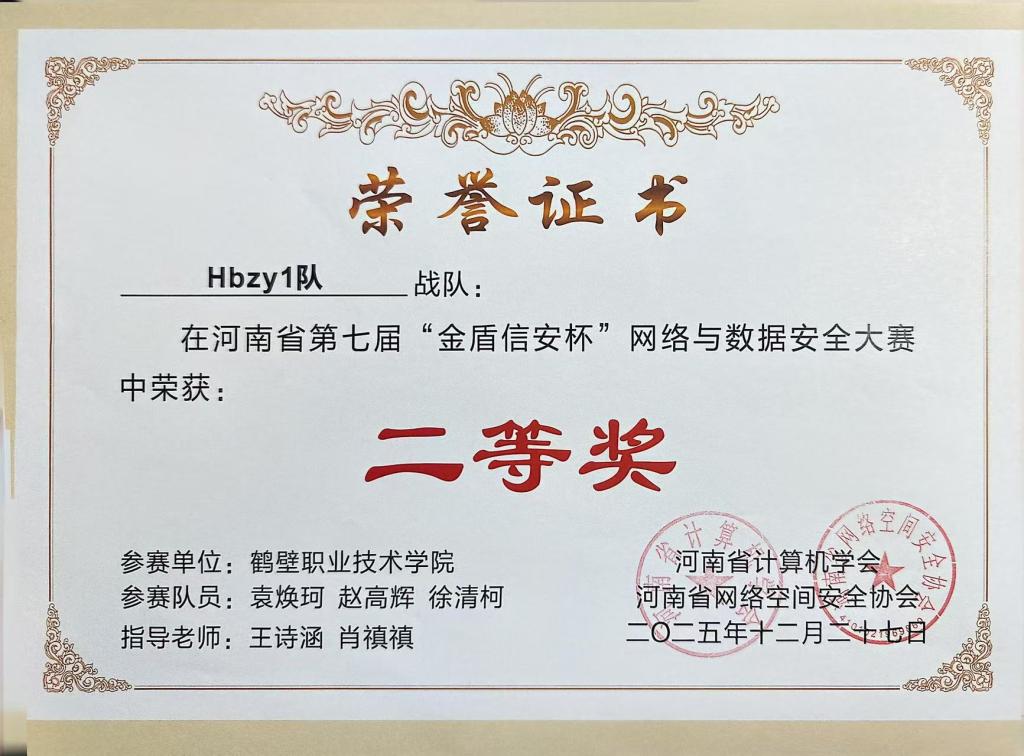 近日,河南省第七届“金盾信安杯”网络安全大赛决赛结果揭晓。我校大数据学院四支参赛队荣获二等奖1项、三等奖3项的优异成绩,充分彰显了我校在网络安全领域人才培养的扎实成效。
