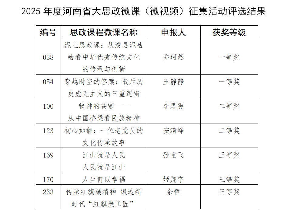 近日,河南省社科联、共青团河南省委、河南省高等教育学会联合公布《关于公布2025年度河南省大思政微课(微视频)征集活动评选结果的通知》(豫社科联字〔2025〕22号),马克思主义学院教师在此次活动中表现突出,共荣获思政课程微课一等奖2项、二等奖2项、三等奖3项。