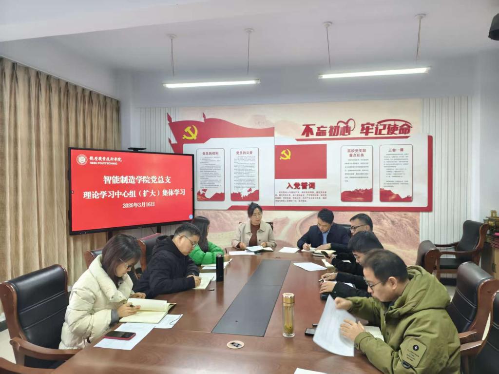 为深入学习贯彻全国两会精神,切实把思想和行动统一到党中央决策部署上来,3月16日上午,智能制造学院党总支召开理论学习中心组(扩大)集体学习会,专题学习十四届全国人大四次会议精神。学院党总支书记崔国英主持会议,学院学习中心组成员及相关人员参加学习。