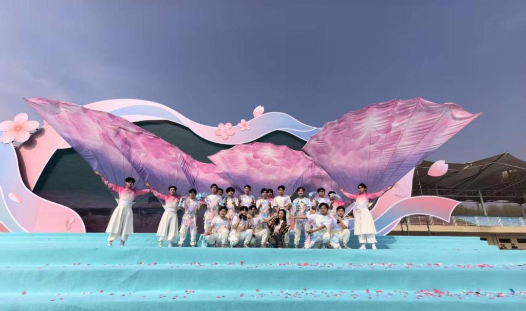 鹤舞樱飞,向新而行。4月2日,2026鹤壁樱花季文旅推介大会在鹤壁市体育公园足球场盛大开幕。交通服务与管理学院新时代文明实践点20名志愿服务队队员,经过一周的高强度排练,以昂扬之态、翩跹舞姿亮相开幕式。