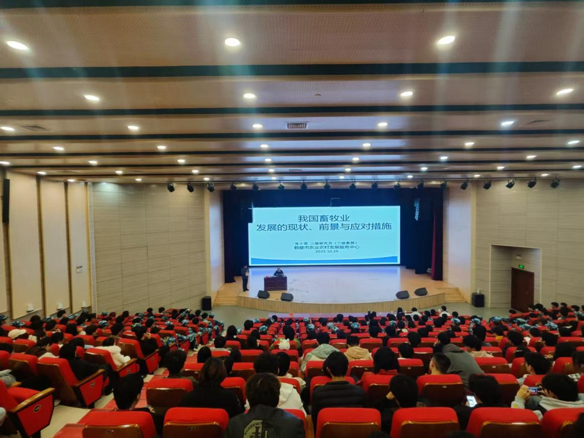 10月29日,食品与化工学院第40期“美好食光大讲堂”在海棠园校区诚信礼堂如期举行,现场座无虚席,学术氛围浓厚。本期讲座特邀鹤壁市农业农村发展服务中心三级教授张小雷,为学院师生带来了一场题为《我国畜牧业发展的现状、前景与应对措施》的专题学术报告。学院教师代表以及2024级、2025级畜牧兽医专业学生共计400余人到场聆听。