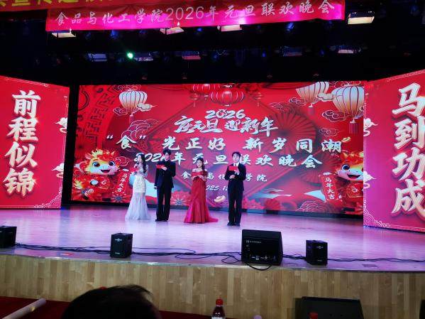 为迎接2026年元旦佳节,丰富校园文化生活,凝聚学院发展合力,食品与化工学院于12月26日晚在诚信礼堂成功举办元旦联欢晚会。学院党总支副书记王跃强、专职组织员王永刚、副院长翟新贵等领导班子成员与全院师生代表约500人共同观看演出,喜迎新年。鹤壁市药品检验中心主任王曹宇、副主任耿冶飞,中检集团(鹤壁)检验认证有限公司总经理陈岩岩,河南省鹤城迎春花研究院有限公司总经理张志华,鹤壁佰穗肉牛有限公司总经理僧鑫新作为嘉宾出席。