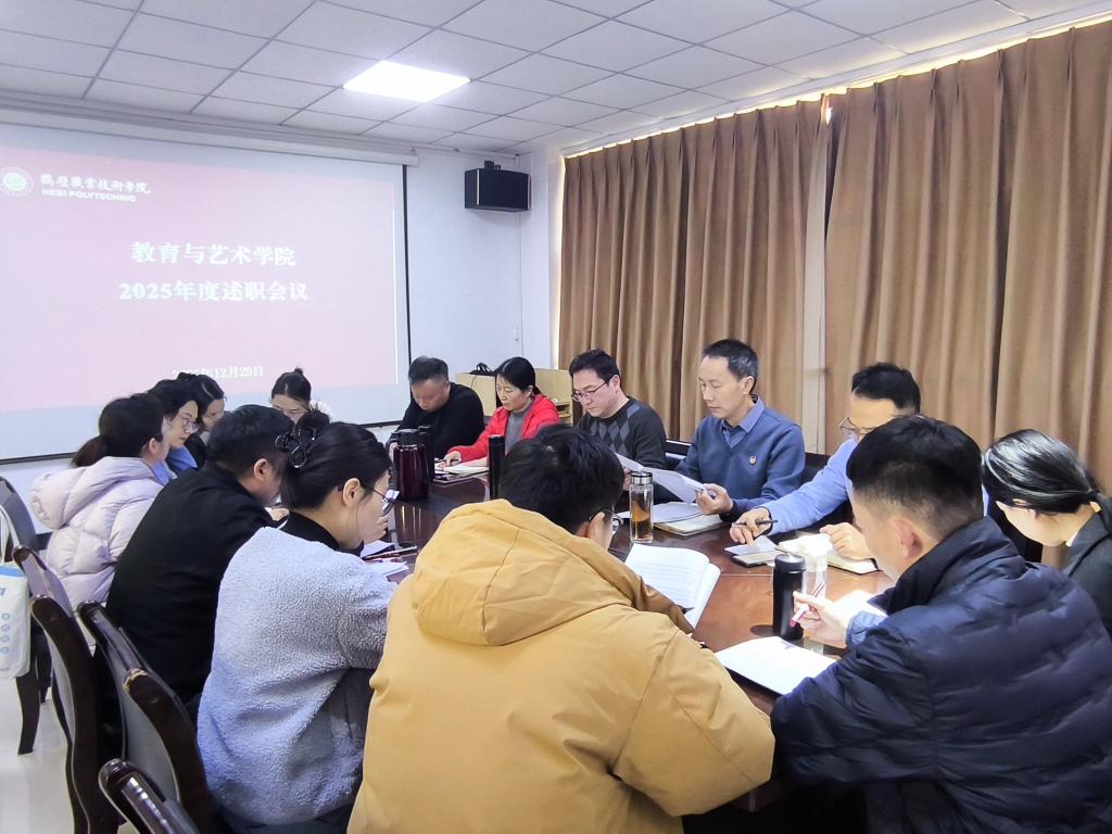 12月29日下午,教育与艺术学院在拓新楼1219会议室召开2025年度述职会议。会议由学院党总支书记裴小鹏主持,各支部书记及科室负责人参加。会议集中听取了学院党支部及各科室年度工作述职。