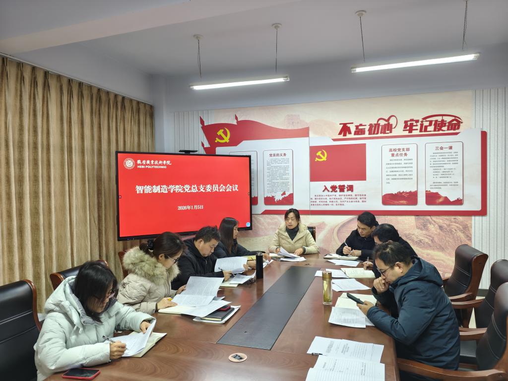 2026年1月5日上午,智能制造学院党总支委员会会议在4219会议室顺利召开。会议以强化理论武装为核心,聚焦党建工作重点任务,系统部署述职评议、民主生活会和组织生活会等关键工作,为学院高质量发展筑牢政治根基和组织保障。