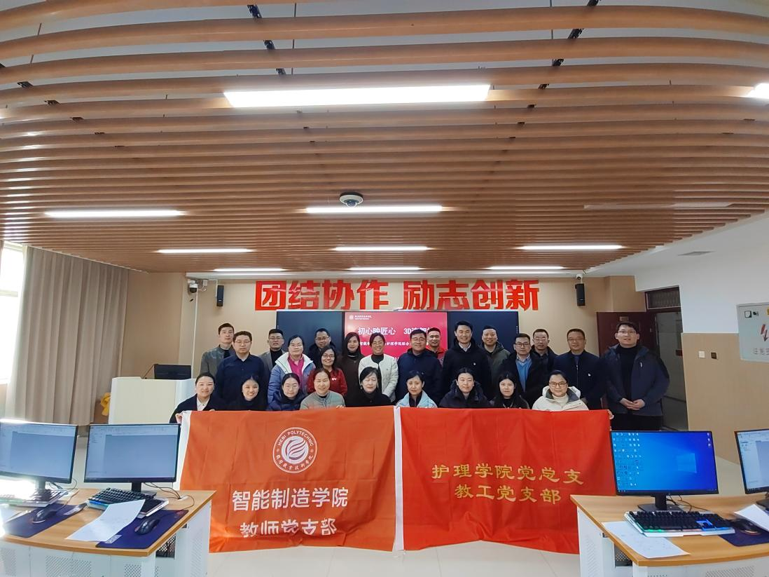 为深入贯彻落实“党建引领学科融合,科技赋能民生服务”的发展理念,2026年1月15日,智能制造学院教师党支部与护理学院教师党支部以“初心映匠心·3D连智护”为主题,联合开展跨界融合主题党日活动。两学院党员教师齐聚4413实训室,以党建为桥、以技术为媒,共同探索智能制造与现代护理的创新结合点,让初心使命在实践中扎根,让工匠精神在融合中闪光。