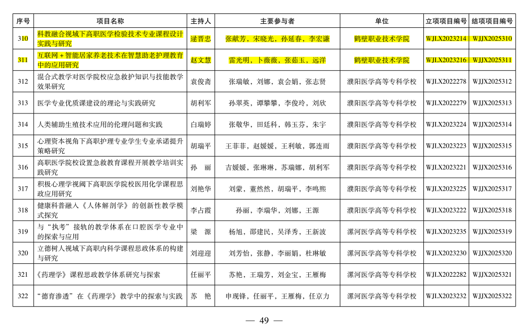 根据《河南省卫生健康委员会关于公布2025年河南省医学教育研究项目立项和结项名单的通知》(豫卫科教函〔2025〕21号),我校申报的3个医学教育研究项目顺利通过结项验收,同时成功立项2025年河南省医学教育研究项目2个,立项数量在省内同类职业院校中位于前列。