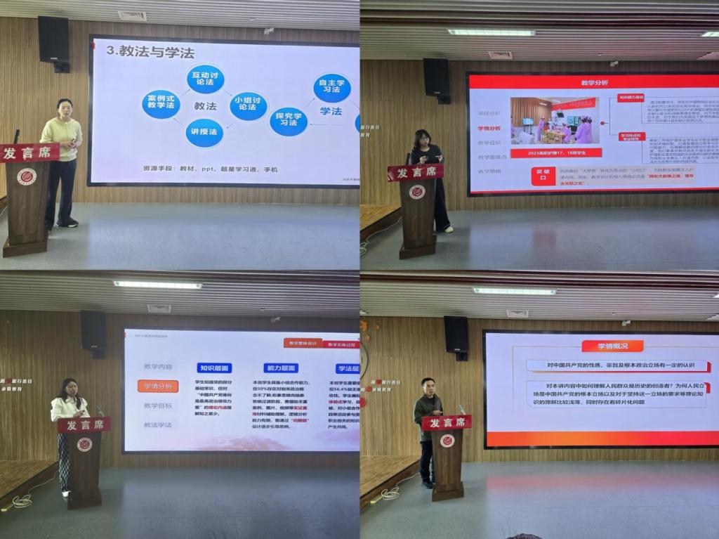 备课会上,副院长刘断思通报了开学以来“习近平新时代中国特色社会主义思想概论”课程上课情况。孙童飞、王晨晨、李思雯、吴军安四位教师分别围绕“以中国式现代化推进中华民族伟大复兴”“中华民族近代以来最伟大的梦想”“坚持党的全面领导”“坚持以人民为中心”主题内容,从学生学情分析、教学重难点剖析、教学内容设计、教学案例运用等方面进行说课分享,形势与政策教研室主任王丽娟对4位教师的说课情况进行了点评。