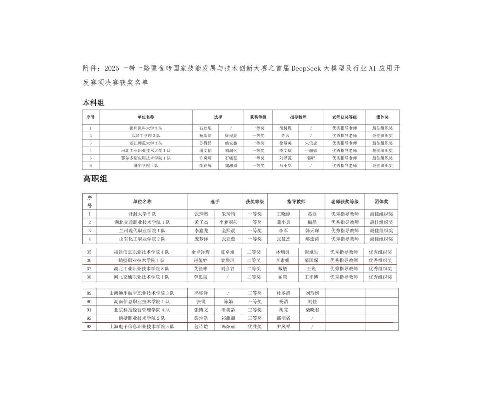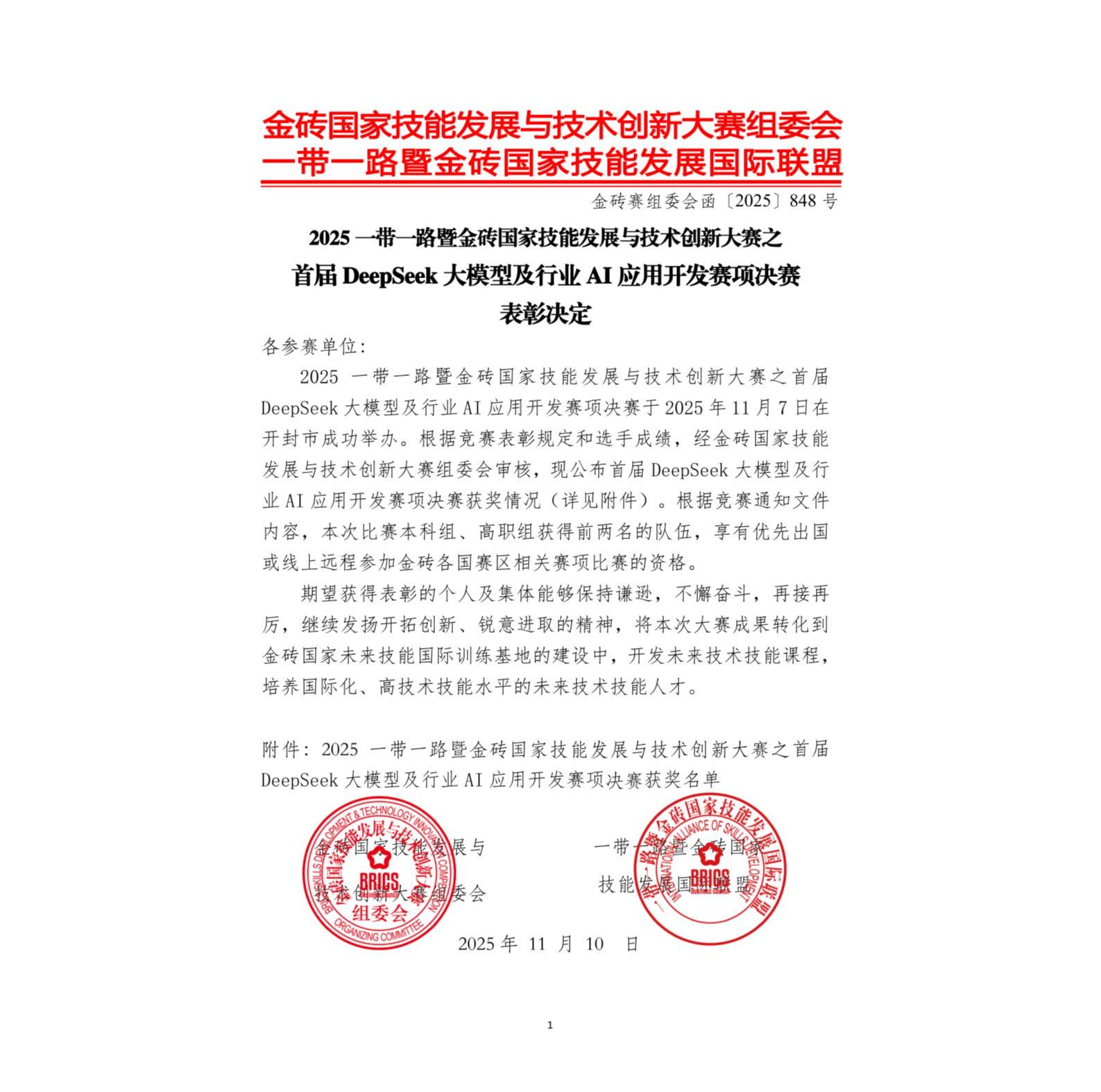11月7日至8日,2025一带一路暨金砖国家技能发展与技术创新大赛之首届DeepSeek大模型及行业AI应用开发赛项全国决赛在开封大学圆满落幕。我校大数据学院、人工智能学院参赛队凭借出色表现,从全国高职组晋级队伍中脱颖而出,荣获全国总决赛二等奖、三等奖。我校同时获优秀组织奖。