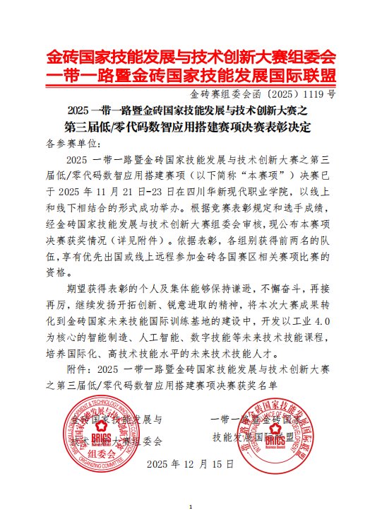 近日,在2025“一带一路”暨金砖国家技能发展与技术创新大赛之第三届低/零代码数智应用搭建赛项全国总决赛中,我校大数据学院参赛学生表现优异,荣获国家三等奖5项。